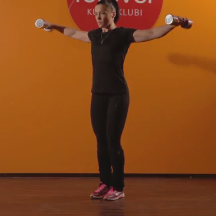 Pidä selkä suorana ja keskivartalo tiukkana. Pyri pitämään vartalo mahdollisimman paikoillaan. Lähde nostamaan käsiä suorina alhaalta eteen hartioiden tasolle. Rauhallinen palautus.
